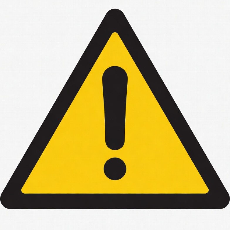 A bright yellow triangular warning sign with bold black borders. Inside the triangle, a large black exclamation mark sits above a small black dot. The graphic is simple and isolated on a white background.
