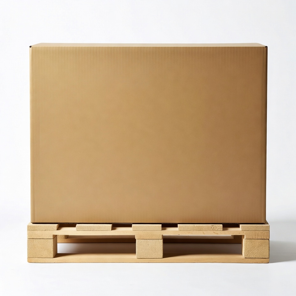A large brown cardboard box sits on a wooden pallet. The box is centered on the pallet with its front side facing forward. The entire setup is isolated against a plain white background.