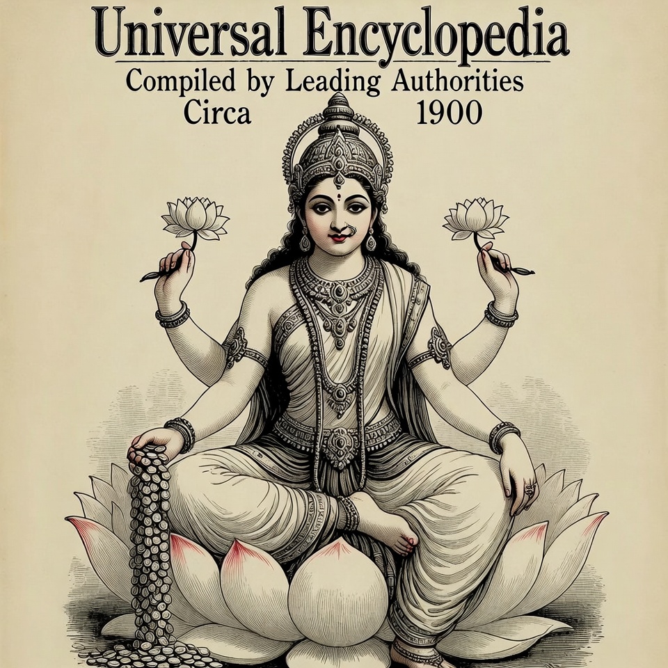 Vintage illustration of Hindu goddess Lakshmi seated on a large lotus flower with multiple arms holding lotuses and gold coins. She wears traditional white sari with gold jewelry and a crown. The artwork features ornate black line details on a beige background from a 1900 Universal Encyclopedia.
