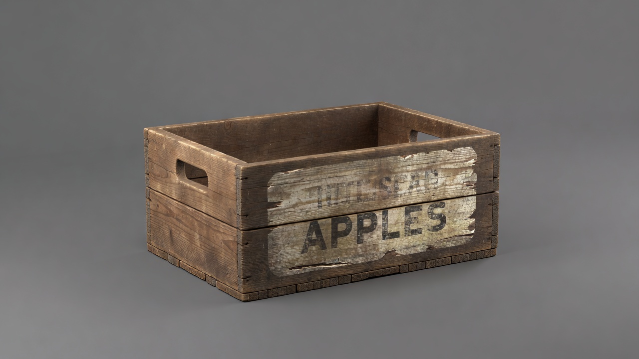 3D render, apple box, apples crate, distressed label, empty crate, fruit crate, gray background, handles, isolated background, rustic crate, slatted crate, vintage crate, weathered wood, wooden box, wooden crate