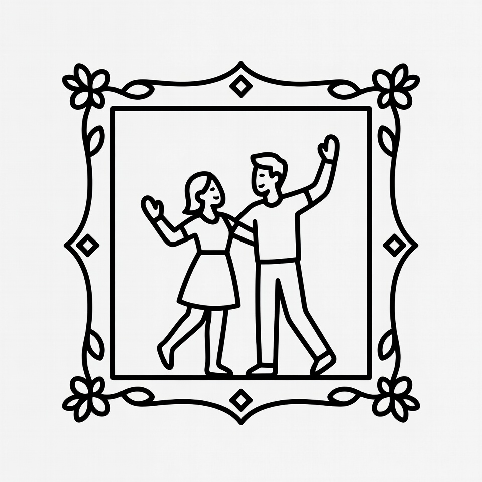 A black line art illustration depicts a happy couple dancing together inside a decorative floral frame. The woman wears a dress and raises one arm while lifting a leg, and the man in pants and a shirt raises both arms. The ornate frame features pointed corners and swirling floral designs.
