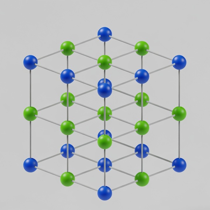 A 3D molecular model depicts a cubic crystal lattice with alternating blue and green spheres connected by gray bonds. The structure forms a symmetrical octahedron-like framework on a white background. Each sphere represents atoms in the lattice arrangement.