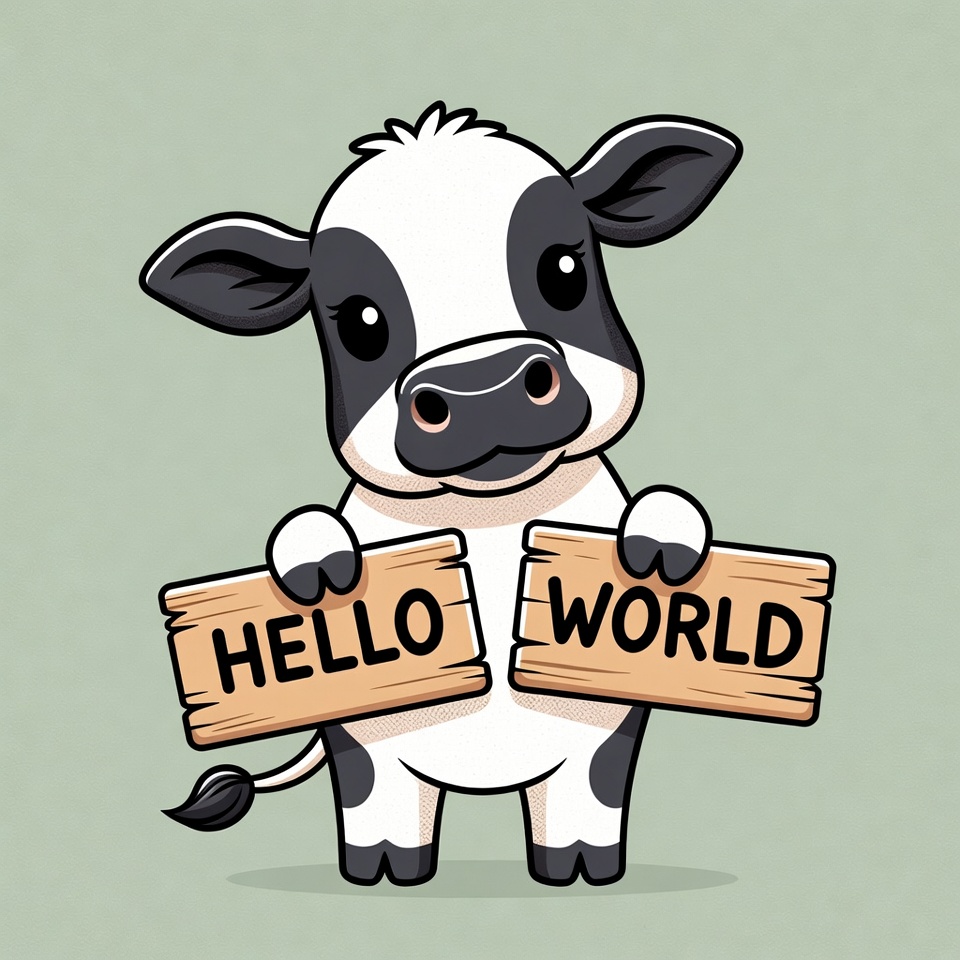 A cartoon Holstein calf with black and white spots stands on a light green background holding two wooden signs. The left sign reads 'HELLO' and the right sign reads 'WORLD' in bold letters. The calf has large expressive eyes, a pink nose, and a small tail.