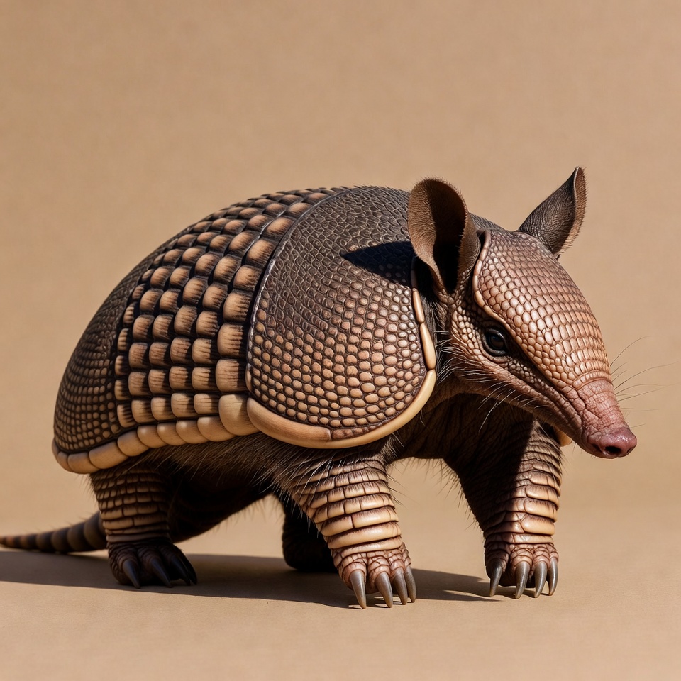A detailed armadillo with armored shell stands on a plain beige background. Its body features a mosaic of brown scales, small ears, and a pointed snout. The creature has short legs with claws and a long tail.