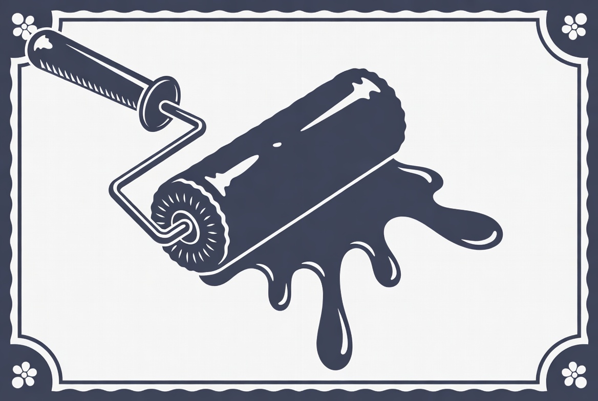 A black silhouette illustration of a paint roller with dripping paint is centered on a white background. The roller has a handle and textured cylinder with paint splatters extending downward. It is framed by an ornate white border with floral corners.