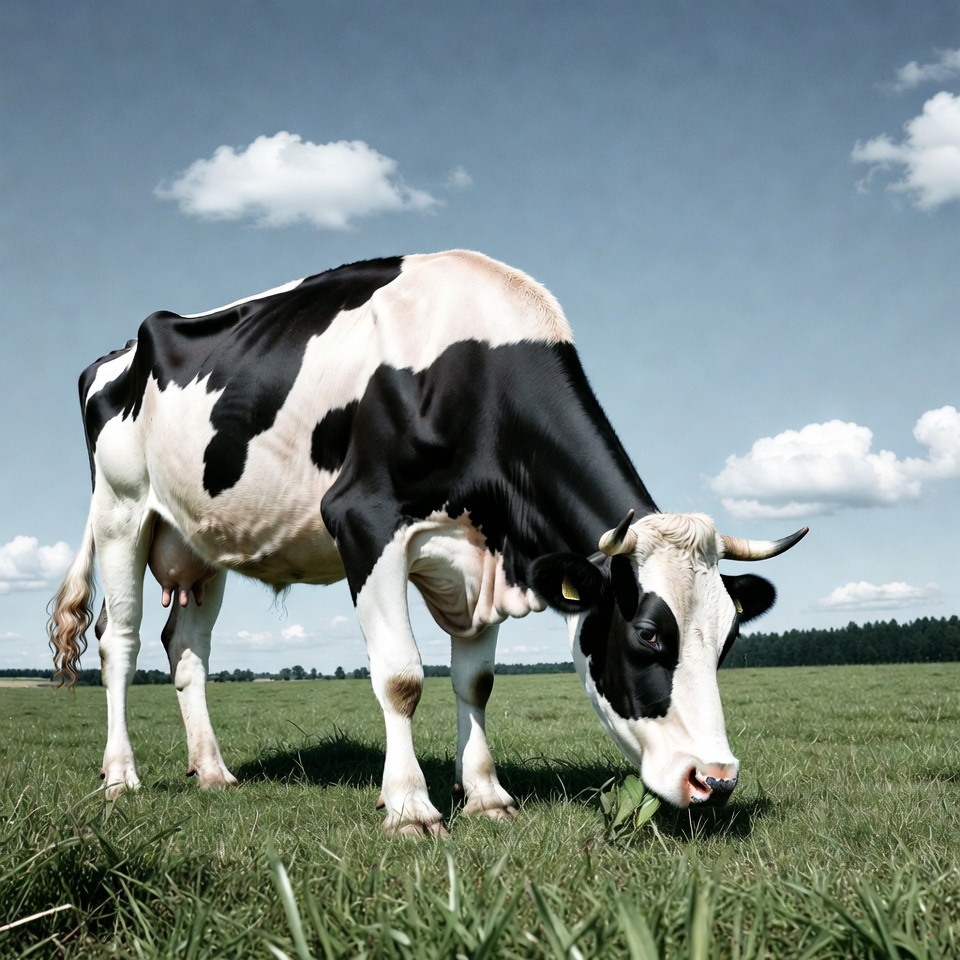 A black and white Holstein cow grazes on fresh green grass in an open field. Fluffy white clouds dot the blue sky above, with a forest visible in the distant background. The cow has a yellow ear tag and stands with its head lowered to eat.