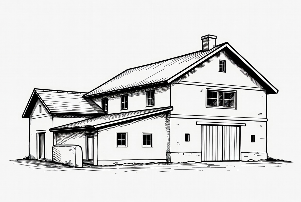 A detailed black line drawing depicts a rustic barn-style farmhouse with a sloped roof and chimney. The structure features large double doors on one side, multiple windows, and an attached smaller building. It is illustrated on an isolated white background.
