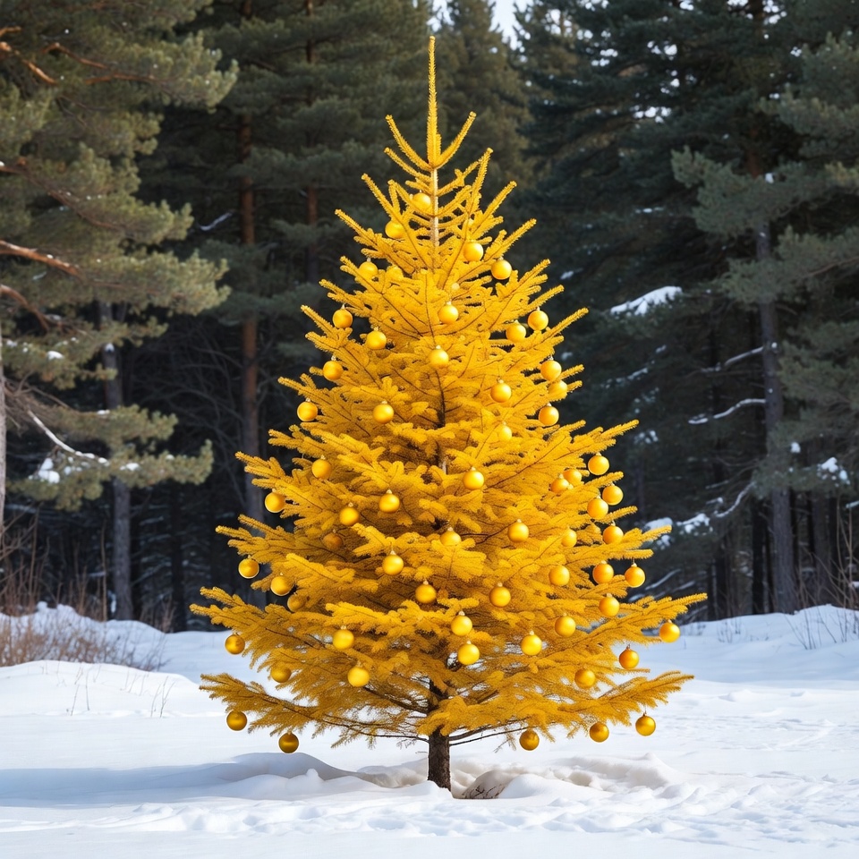 A vibrant yellow Christmas tree decorated with yellow ornaments stands in a snowy clearing surrounded by dark green pine trees. The tree's bright golden needles and balls contrast sharply against the white snow and evergreen forest background. Fresh snow covers the ground around the base of the tree.