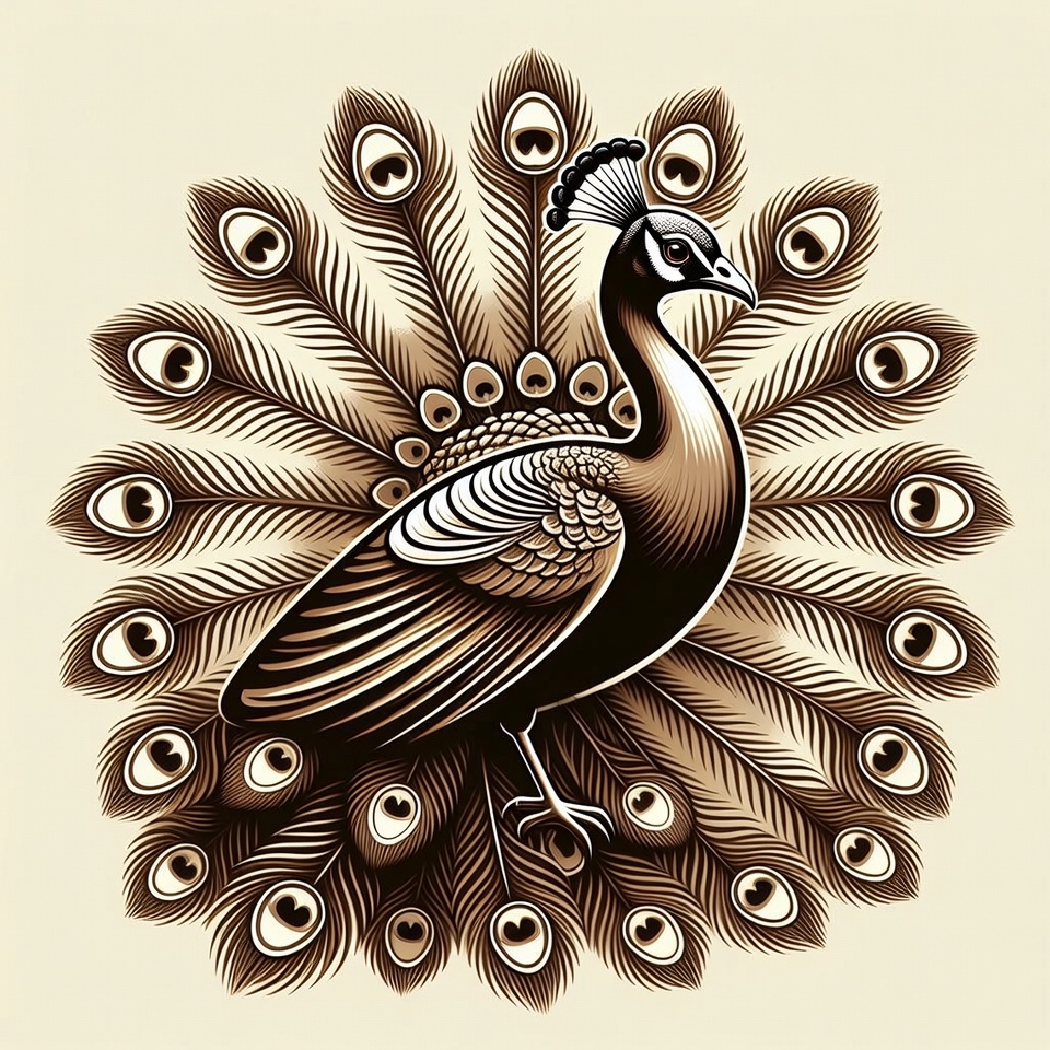 A detailed illustration of a peacock displaying its vibrant tail feathers in full fan shape. The bird features intricate line art with brown, gold, and white tones on a light beige background. Numerous eye-like patterns adorn the elegant feathers.