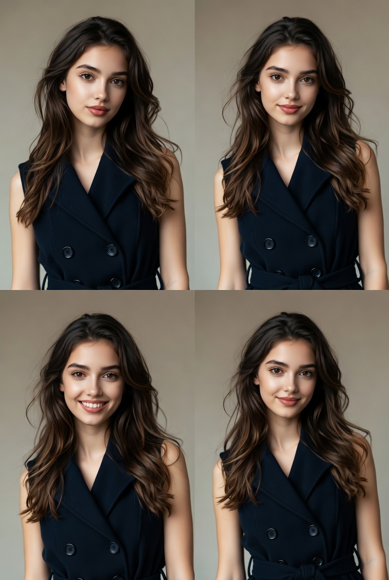 Four close-up portraits of a young woman with long wavy brown hair wearing a black sleeveless double-breasted blazer. She has a friendly smile and direct gaze in each photo, arranged in a 2x2 grid. The images feature neutral expressions and slight variations in her smile.