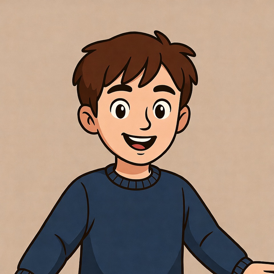 A cartoon illustration of a young boy with brown hair smiles happily on a beige background. He wears a blue crewneck sweater with long sleeves. His large expressive eyes and wide grin give him a cheerful appearance.