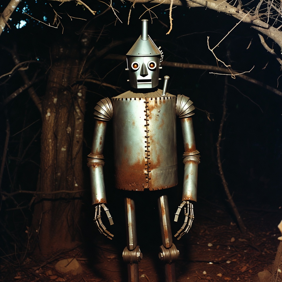 Wizard of Oz, bare trees, character, dark woods, eerie woods, forest, funnel hat, glowing eyes, isolated background, metallic man, movie character, night forest, robot, rusty robot, standing pose, steampunk, trees, Tin Man