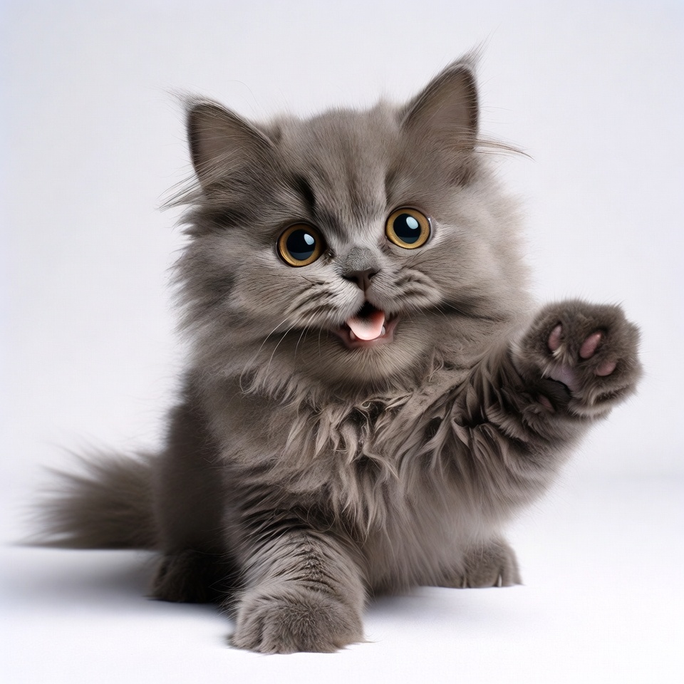 A fluffy grey kitten sits on a white background with its right paw raised in a waving gesture. The kitten has large yellow eyes, an open mouth showing its tongue, and long fur. It appears playful and cute.