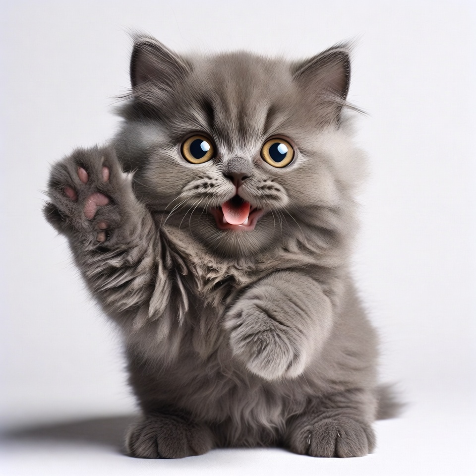 British Shorthair, adorable cat, baby cat, cat, cute kitten, fluffy kitten, grey cat, isolated background, open mouth, paw pads, pet kitten, playful kitten, waving paw, white background, yellow eyes, kitten