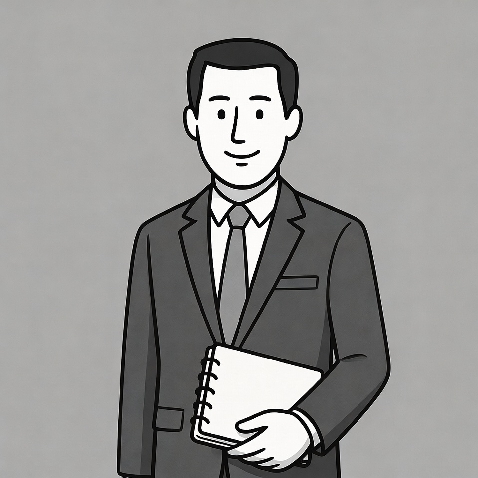 A cartoon illustration of a smiling man with short black hair stands against a gray background. He wears a dark suit, white shirt, and red tie. He holds a spiral-bound notebook in his right hand.