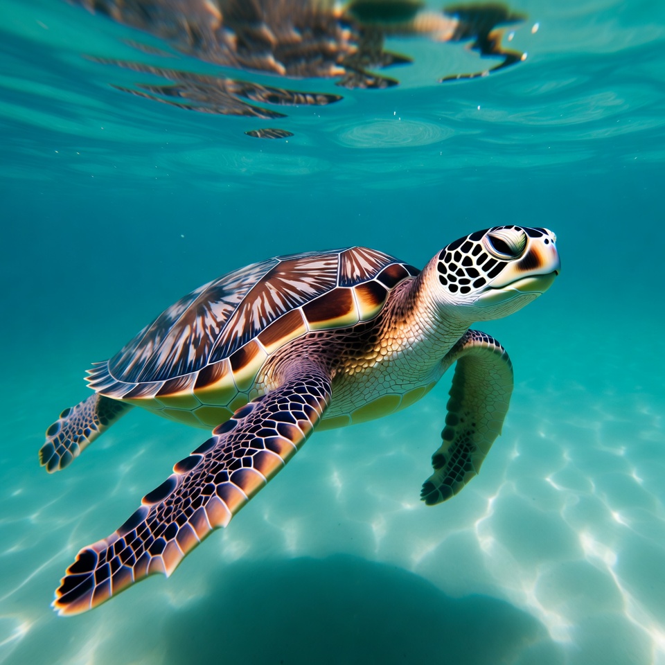 A young green sea turtle swims gracefully in clear turquoise ocean water. Its detailed shell features intricate brown, green, and yellow patterns, with flippers extended. Sunlight filters through the water, creating ripples and highlights on the turtle.