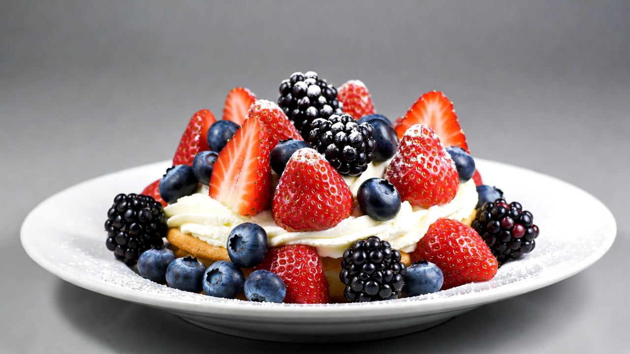 A white plate holds a round pastry tart topped with generous whipped cream. Fresh strawberries, blueberries, and blackberries are piled high on the cream. The dessert is dusted with powdered sugar and placed on a gray background.