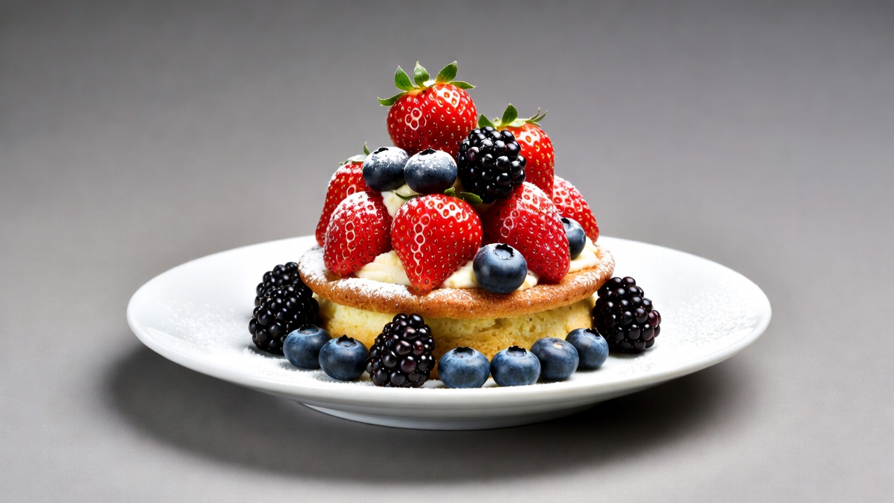 berries, berry tart, blue berries, blueberries, blueberry cake, cake, cream cake, dessert, food photography, fresh berries, fruit dessert, gourmet dessert, pastry, red berries, stacked cake, strawberries, white plate, strawberry cake