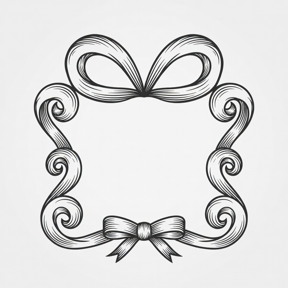 artistic frame, black white, bow frame, bow illustration, clipart, decorative border, doodle border, elegant design, empty frame, floral curls, frame border, gift bow, illustration, line art, ornate frame, ribbon decoration, swirling ribbons, vector art, vintage frame, ribbon bow
