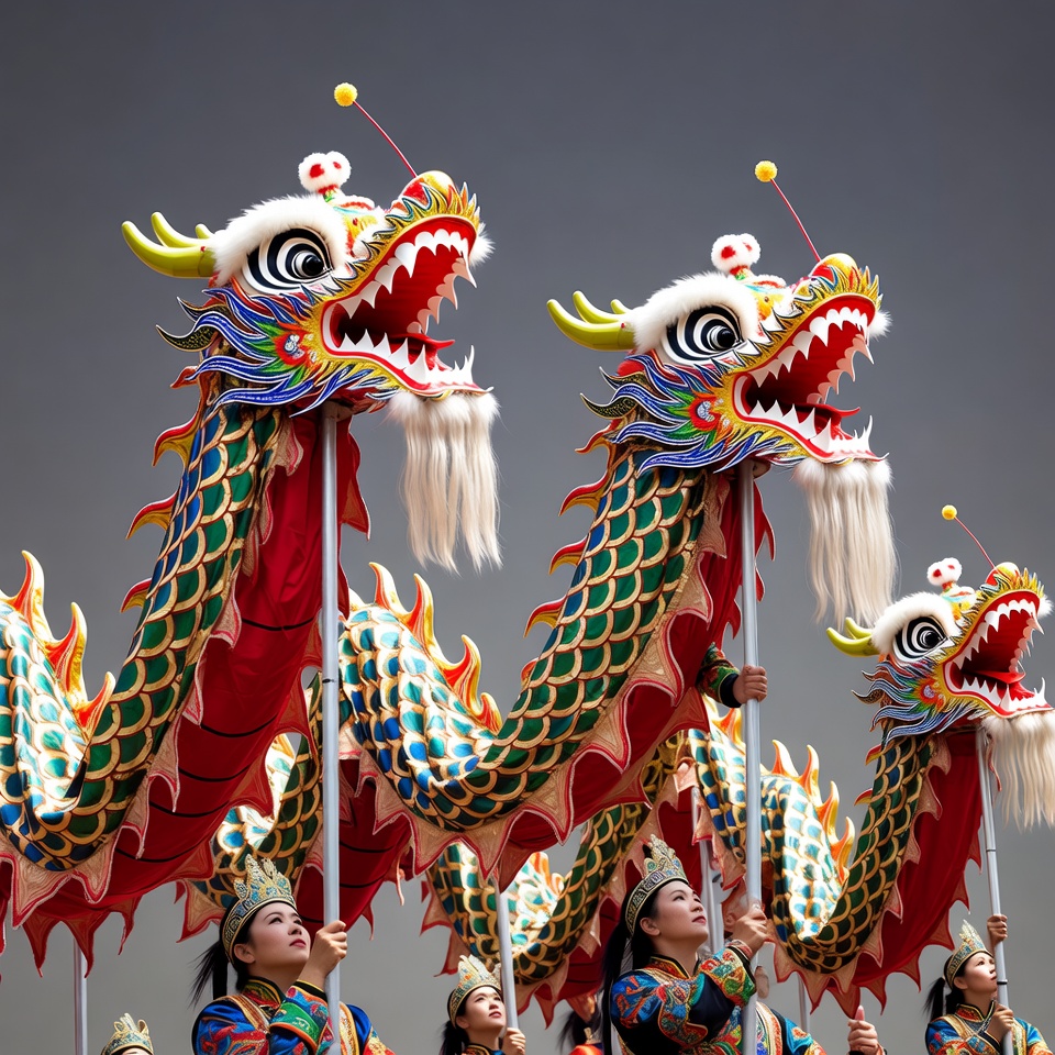 Asian women carrying Chinese dragon heads