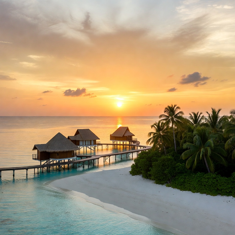 Luxury wooden overwater bungalows extend over turquoise ocean waters on a white sandy beach at sunset. Palm trees and lush greenery frame the scene, with a wooden pier connecting the villas. The sun sets on the horizon, casting orange and golden hues across the sky and calm sea.