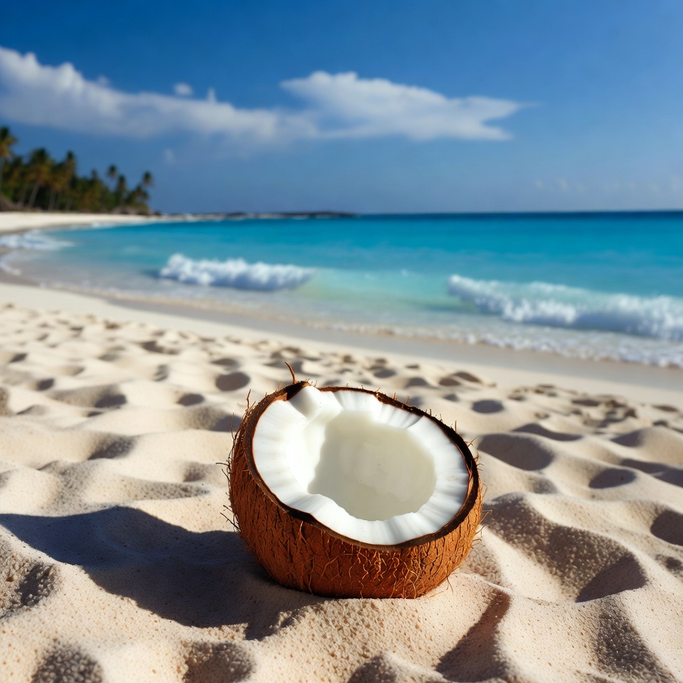 A fresh half coconut with white flesh sits on white sandy beach. Crystal clear turquoise ocean waves and distant palm trees are visible in the background under a bright blue sky with scattered clouds. The scene captures a serene tropical paradise.