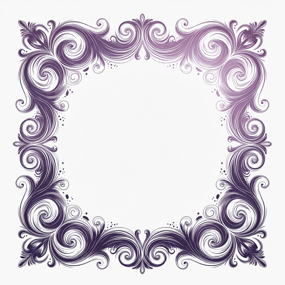 An intricate purple ornamental frame features swirling baroque and rococo floral designs. The elegant border surrounds a large empty white space in the center. It has a vintage, decorative style with fine line details and subtle gradients.