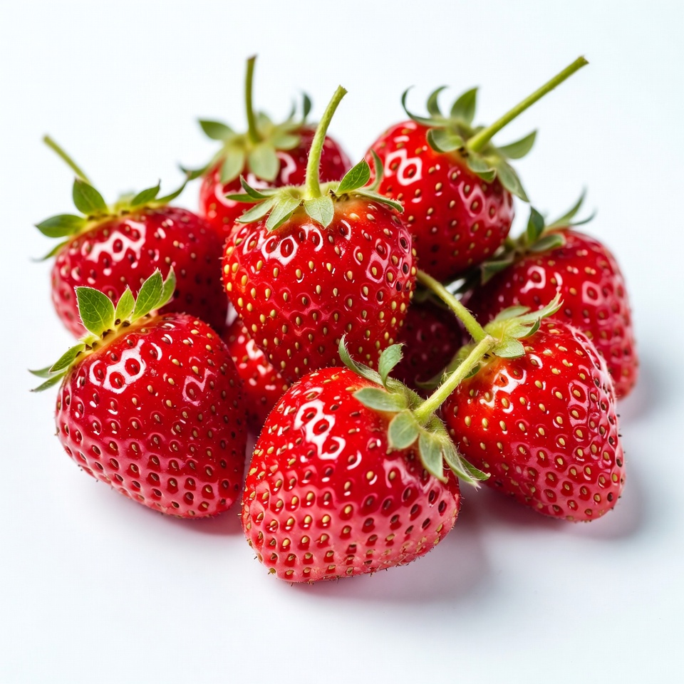 A cluster of ripe red strawberries with green leaves and stems is arranged on a plain white background. The berries display shiny surfaces and small seeds. They are grouped closely together in a circular pile.