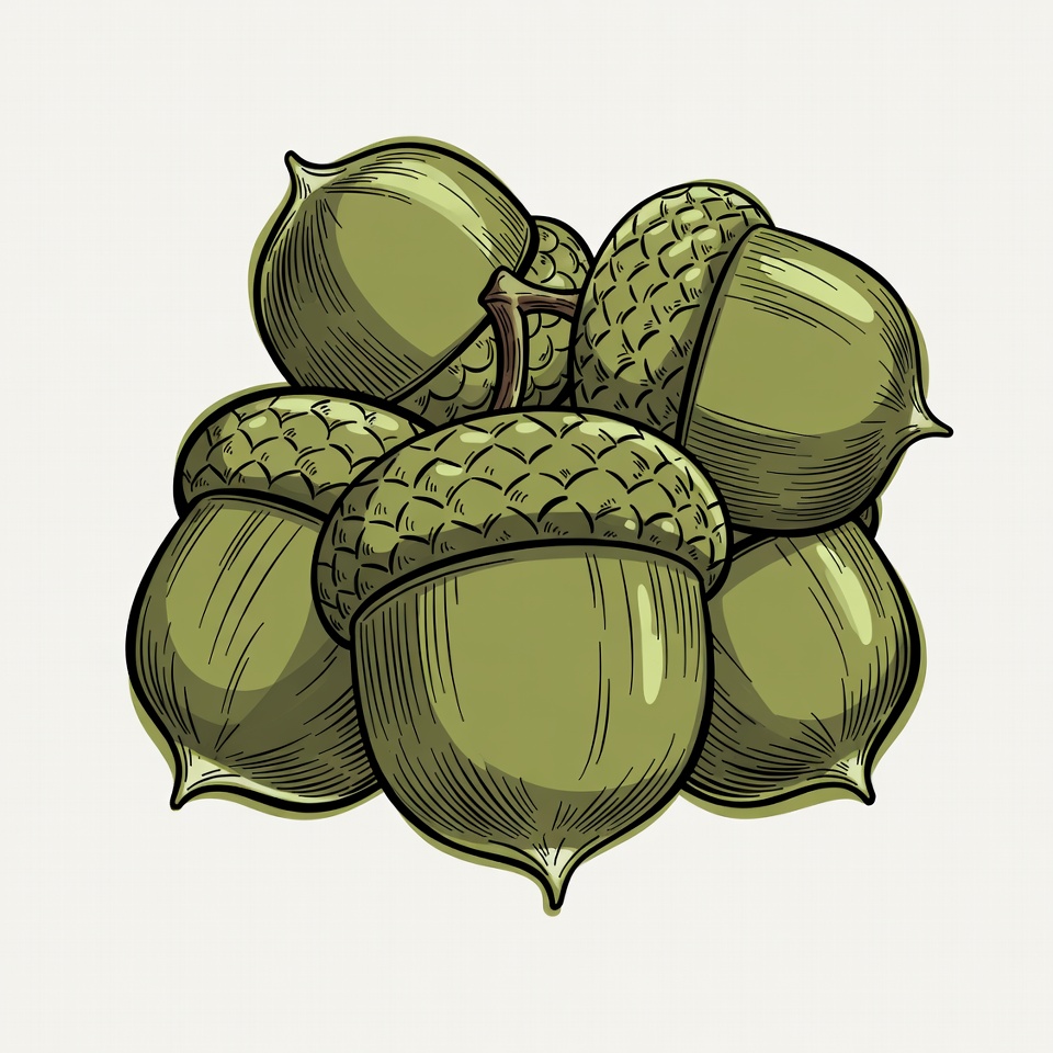 autumn, clipart, cluster, green acorns, hand drawn, illustration, isolated background, line art, nature, nuts, oak nuts, pile, smooth nuts, textured caps, vector style, acorns