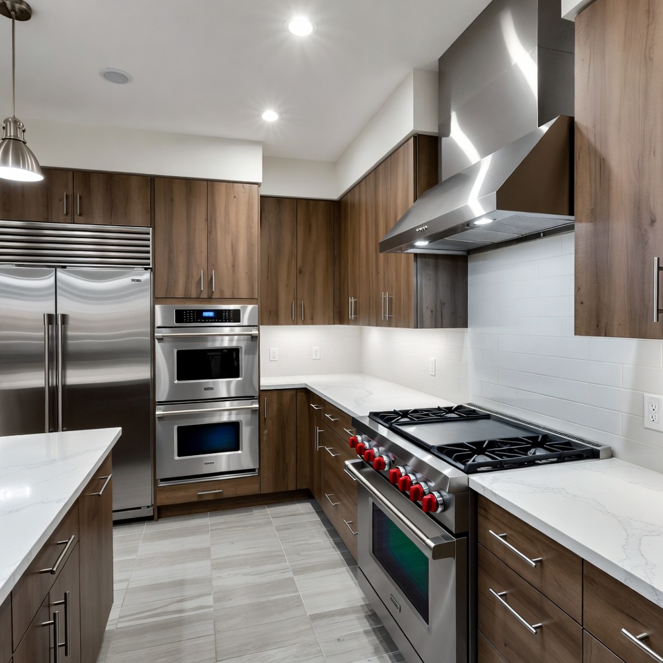 built-in oven, contemporary design, double oven, gas range, gray floor tiles, high-end appliances, kitchen island, kitchen remodel, luxury kitchen, professional range, quartz countertop, range hood, recessed lighting, red knobs, refrigerator, stainless steel appliances, subway tile backsplash, white backsplash, wood cabinets, modern kitchen