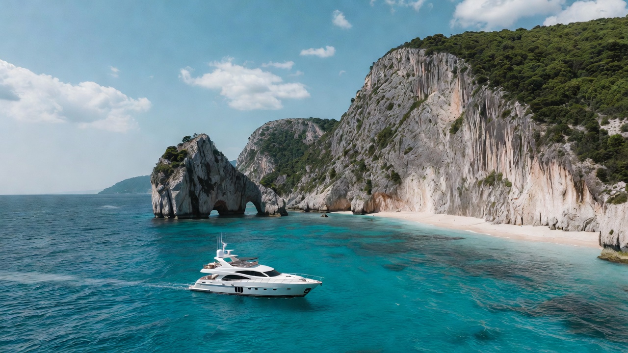 A white luxury yacht sails on clear turquoise waters near dramatic rocky cliffs covered in green vegetation. The cliffs feature natural arches and rise steeply from a small sandy beach. Scattered clouds dot the bright blue sky above the scenic coastal landscape.