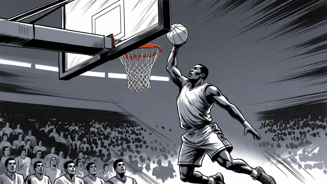 An illustration depicts an African-American man in mid-air performing a powerful basketball dunk. He wears a white jersey and shorts, gripping the basketball with one hand above the rim. A blurred crowd of spectators fills the stadium background.