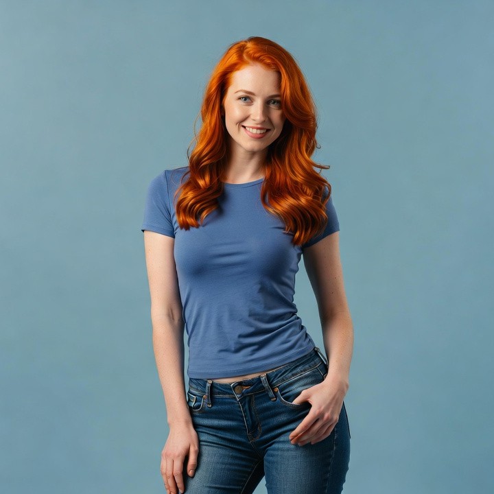 A woman with long wavy red hair smiles at the camera against a solid blue background. She wears a fitted blue t-shirt and blue jeans, standing with one hand on her hip. Her fair skin and green eyes are prominent in the portrait.