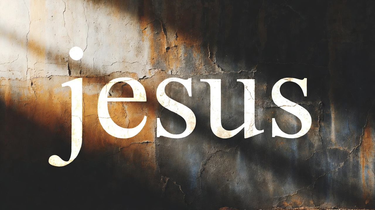 The word 'Jesus' is written in large, elegant white letters on a textured grunge wall. The background features a mix of dark gray, rust, and beige tones with subtle light rays shining through. The dramatic lighting creates a glowing effect around the text.