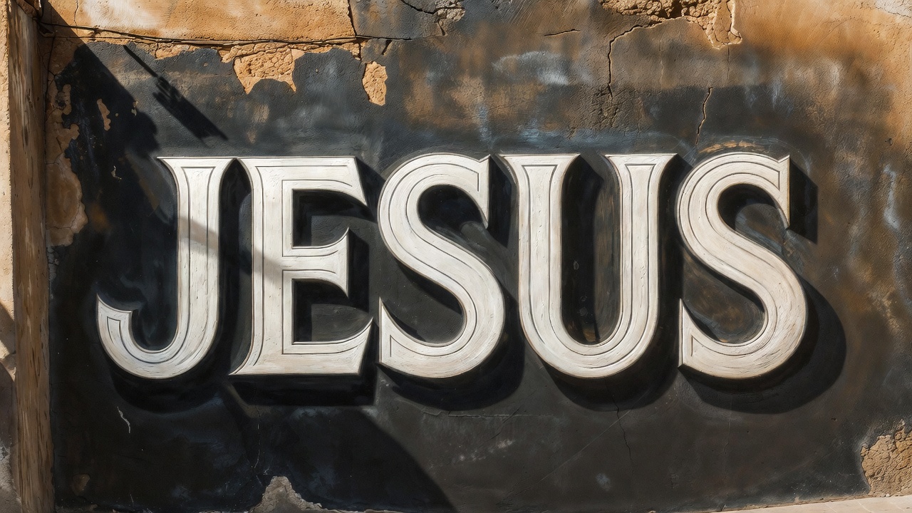 architecture, black background, bold font, carved letters, cracks, engraving, graffiti, inscription, monument, old wall, peeling, raised letters, religious sign, rust, shadows, stone wall, sunlight, texture, uppercase, weathered stone, white text, Jesus