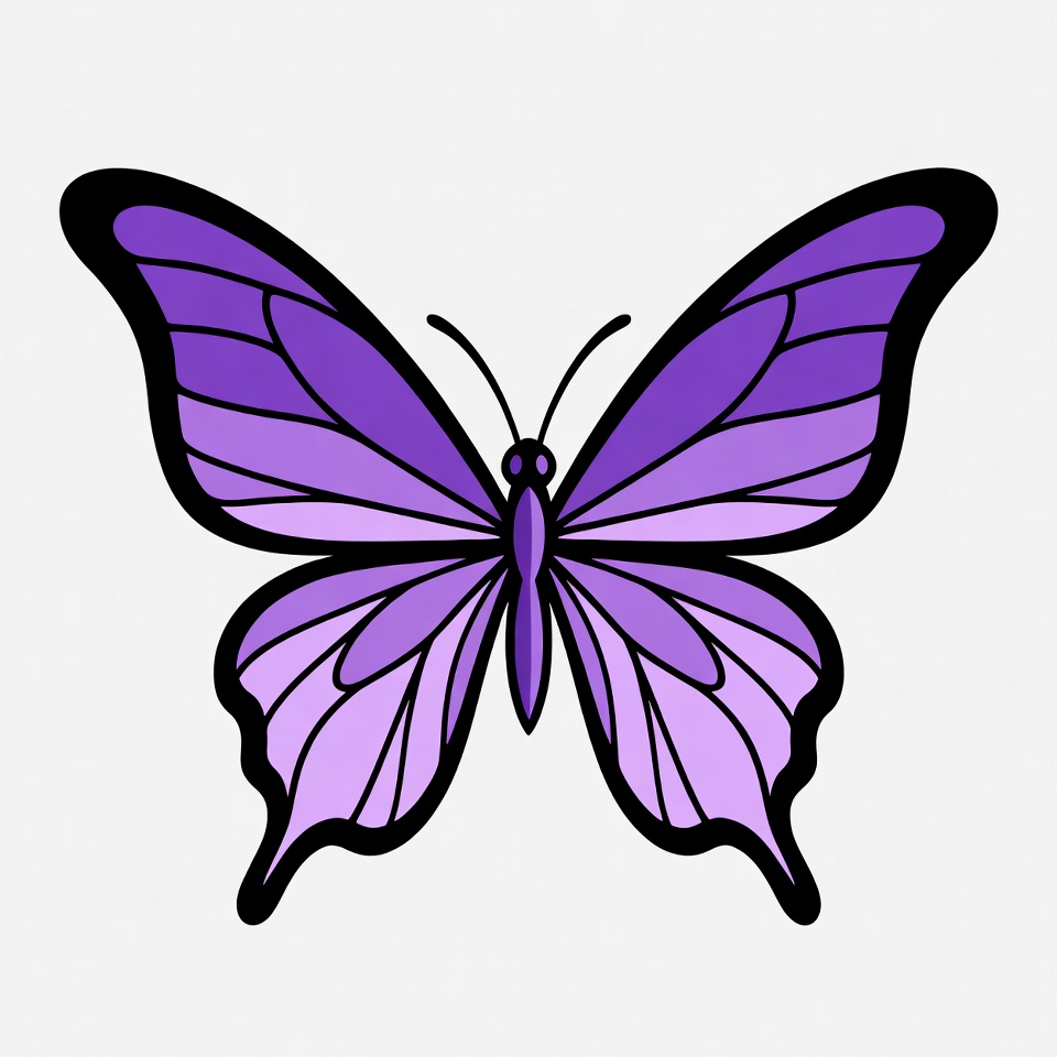 A vibrant purple butterfly illustration with black outlines and shaded gradients on a white background. The wings feature layered purple tones and curved edges. It is centered and isolated for easy use.
