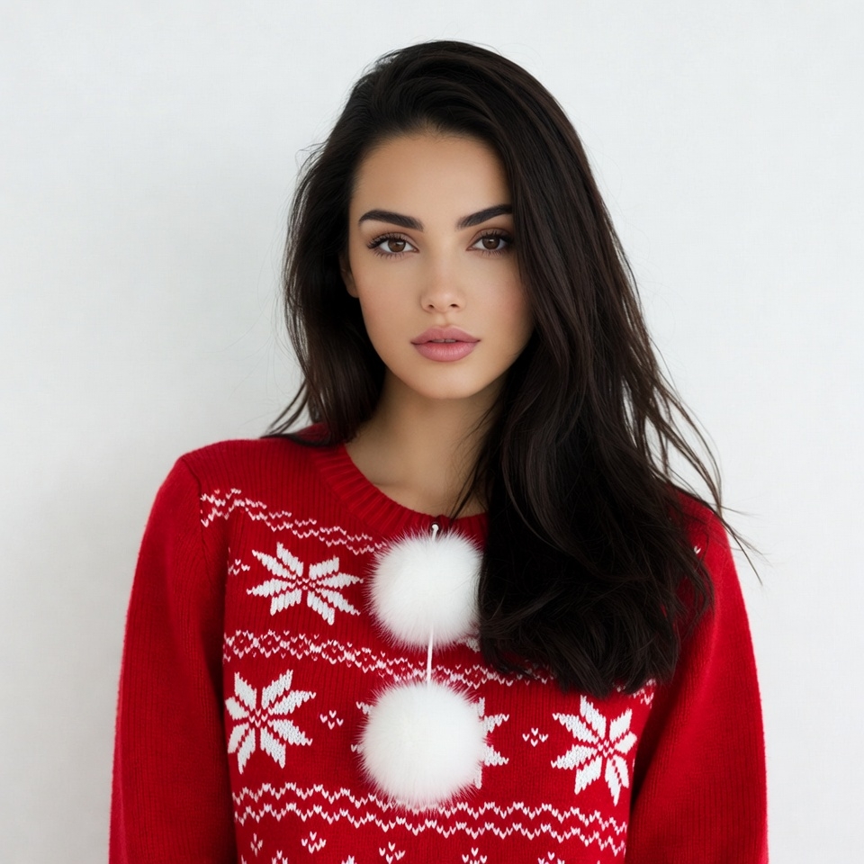 A beautiful woman with long dark hair stands smiling against a white background. She wears a festive red knitted sweater adorned with white snowflakes and fluffy pom-poms. Her makeup is subtle with pink lips, and she poses confidently with hands near her chest.
