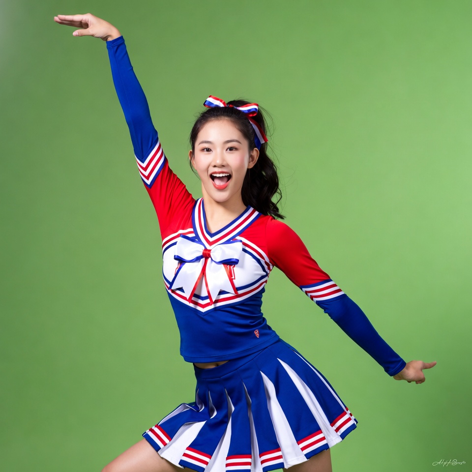 Asian, arms raised, cheerleading uniform, dynamic pose, energetic, excited expression, female, girl, green background, long hair, long sleeves, pleated skirt, ponytail, posing, red bow, red white blue, smiling, sportswear, star emblem, young woman, cheerleader