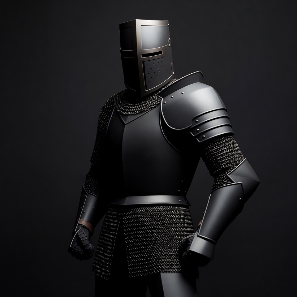3D render, armor, black background, chainmail, chivalric, crusader, dark background, full body, gauntlets, helmet, historical armor, isolated background, male, medieval knight, metallic, plate armor, pose, silver armor, standing, swordless, visor, warrior, knight