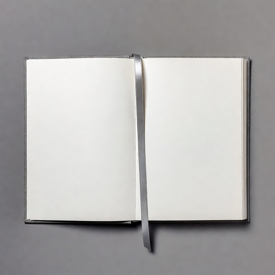 blank book, blank notebook, blank pages, book, empty journal, flat lay, gray cover, hardcover, isolated background, journal, open book, open notebook, ribbon bookmark, top view, white pages, notebook
