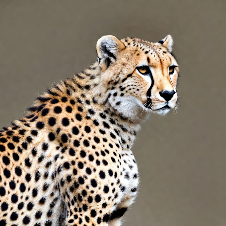 A cheetah stands in profile view against a plain beige background. Its spotted golden fur, large rounded ears, and intense yellow eyes are prominently featured. The cheetah gazes slightly to the side with its muscular body poised.