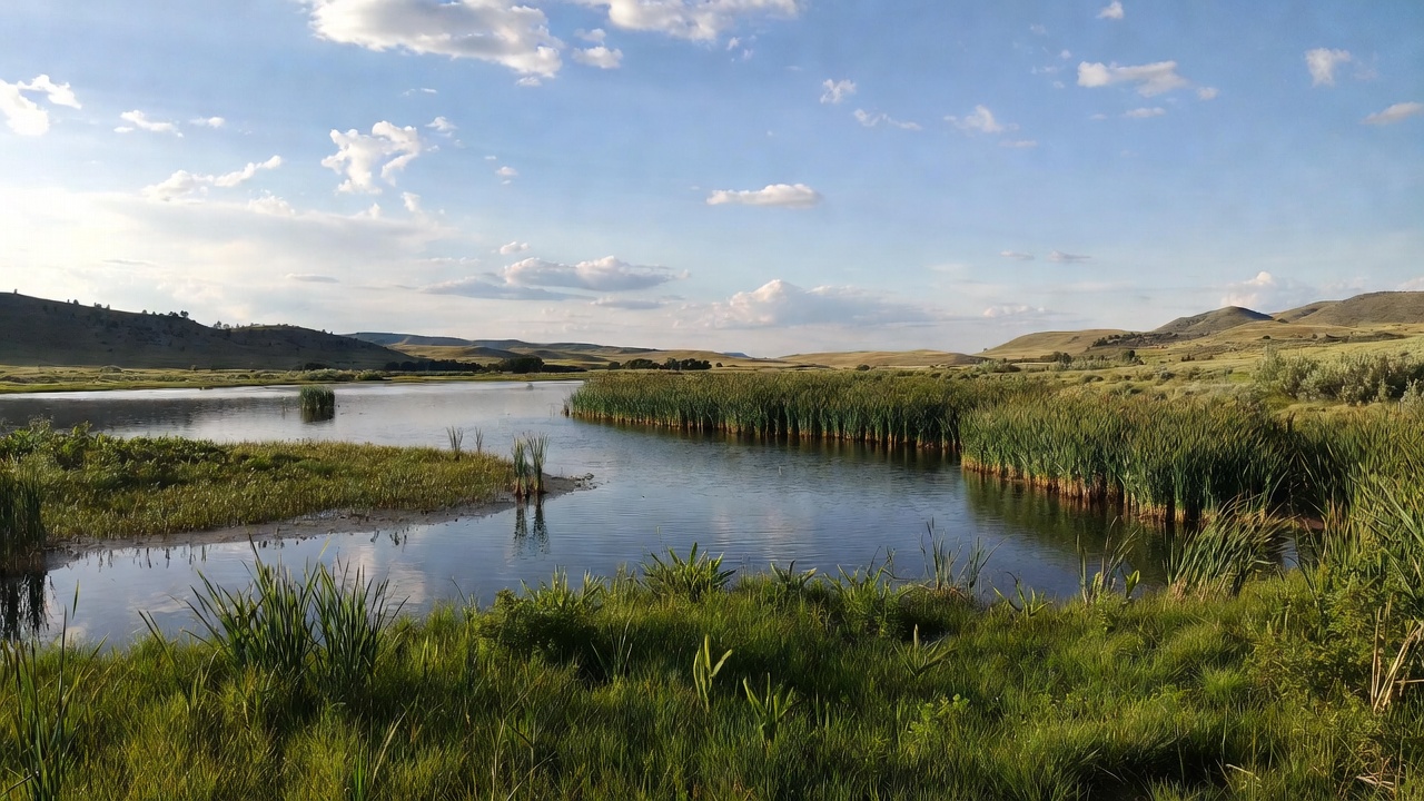 A serene river winds through lush green reed beds and grassy marshes under a clear blue sky with scattered clouds. Distant rolling hills frame the landscape, and calm water reflects the surrounding vegetation. The scene captures a peaceful natural wetland area during daylight.