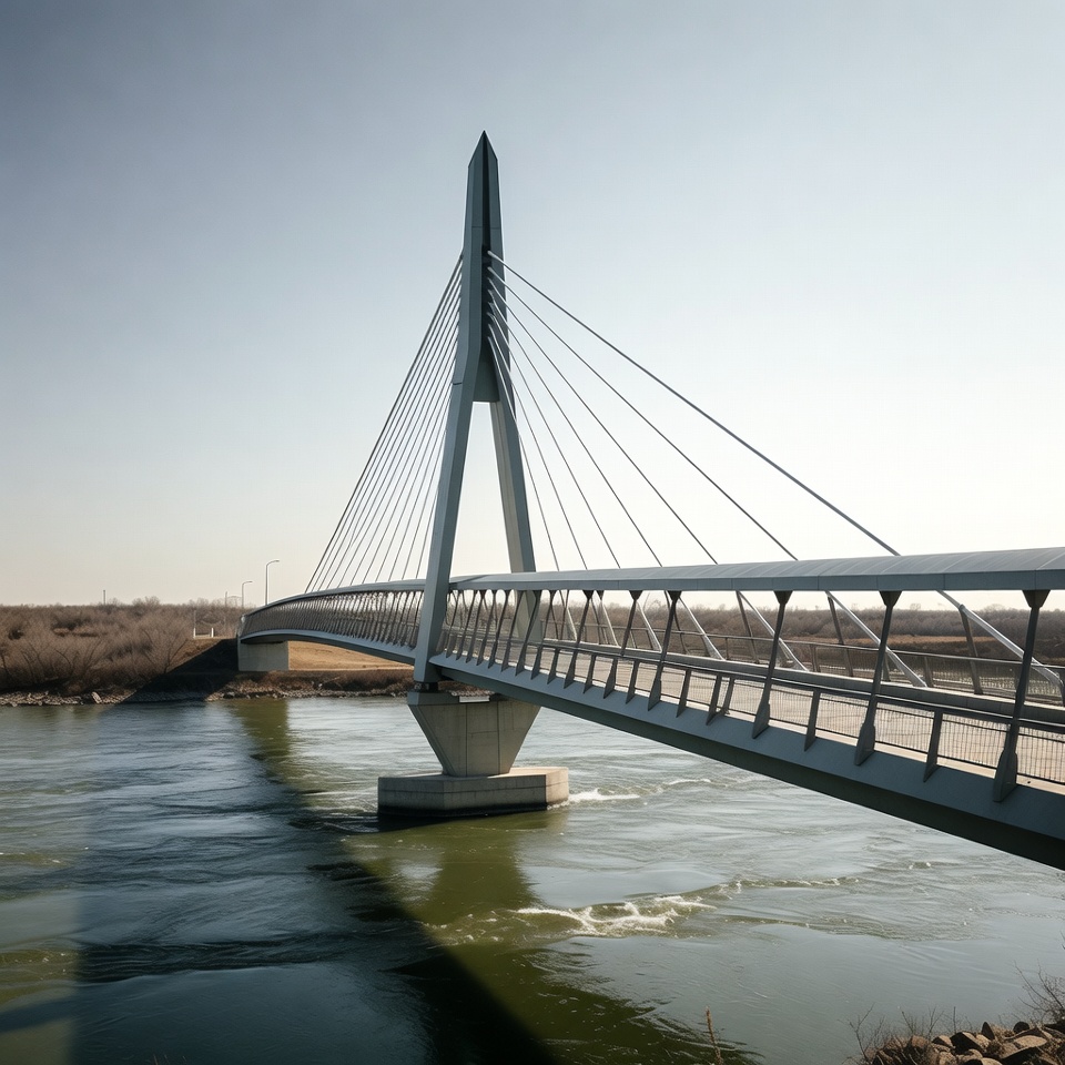 A sleek cable-stayed bridge with a tall central pylon and numerous supporting cables spans a flowing river. The bridge deck is elevated above the water, with concrete piers anchoring it to the riverbanks. Surrounding areas feature dry grass and sparse bushes under a clear sky.