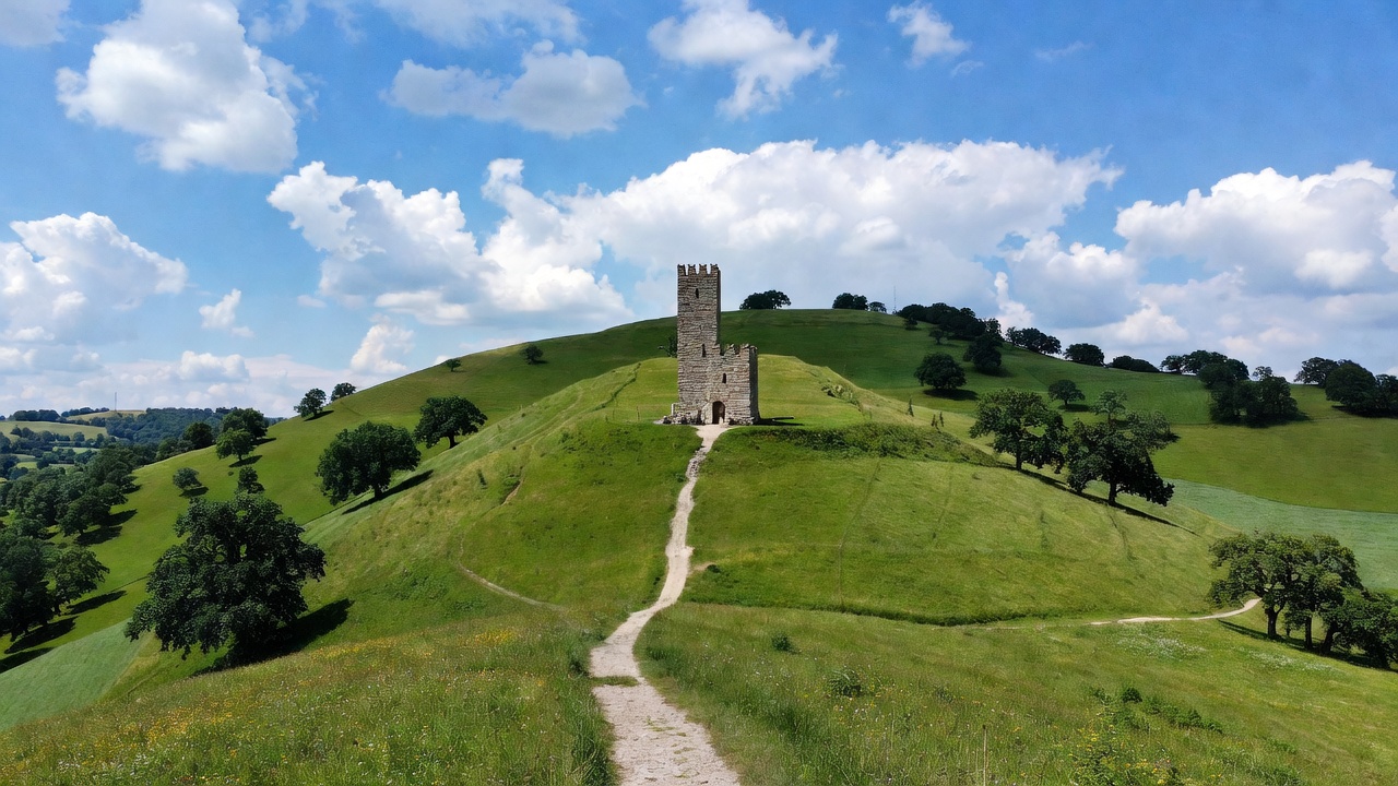 England landmark, aerial view, ancient tower, blue sky, castle tower, clouds, countryside, dirt path, grassy slope, green hill, hilltop tower, historic site, landscape, medieval ruin, nature scenery, oak trees, rolling hills, stone ruins, stone structure, Glastonbury Tor