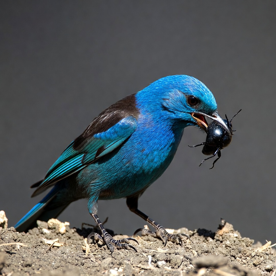 animal, beak, bird, black wings, blue bird, blue feathers, closeup, eating spider, feathers, ground, isolated background, nature, predator, prey, red eyes, soil, songbird, spider, wildlife, indigo bunting