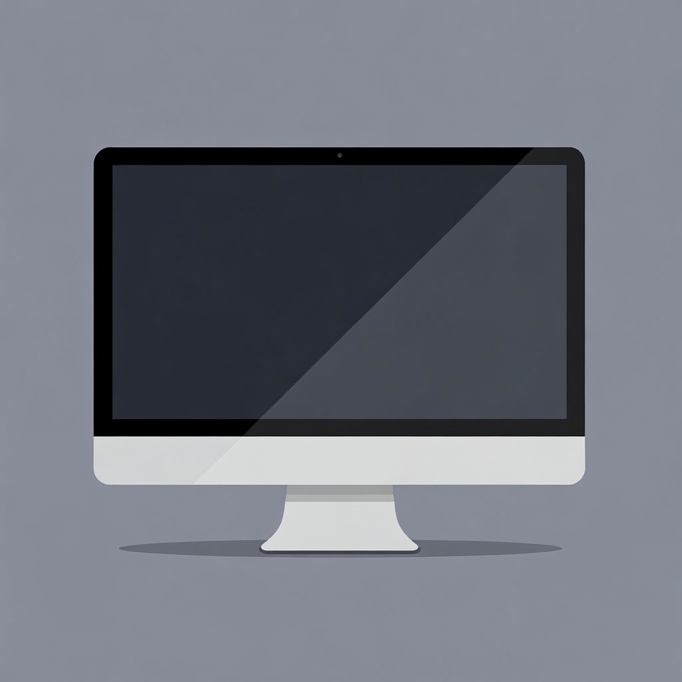 A minimalist flat illustration of a white iMac computer with a black screen and glossy reflections. It stands on a matching white stand against a solid gray background. The design features clean lines and a subtle shadow for depth.