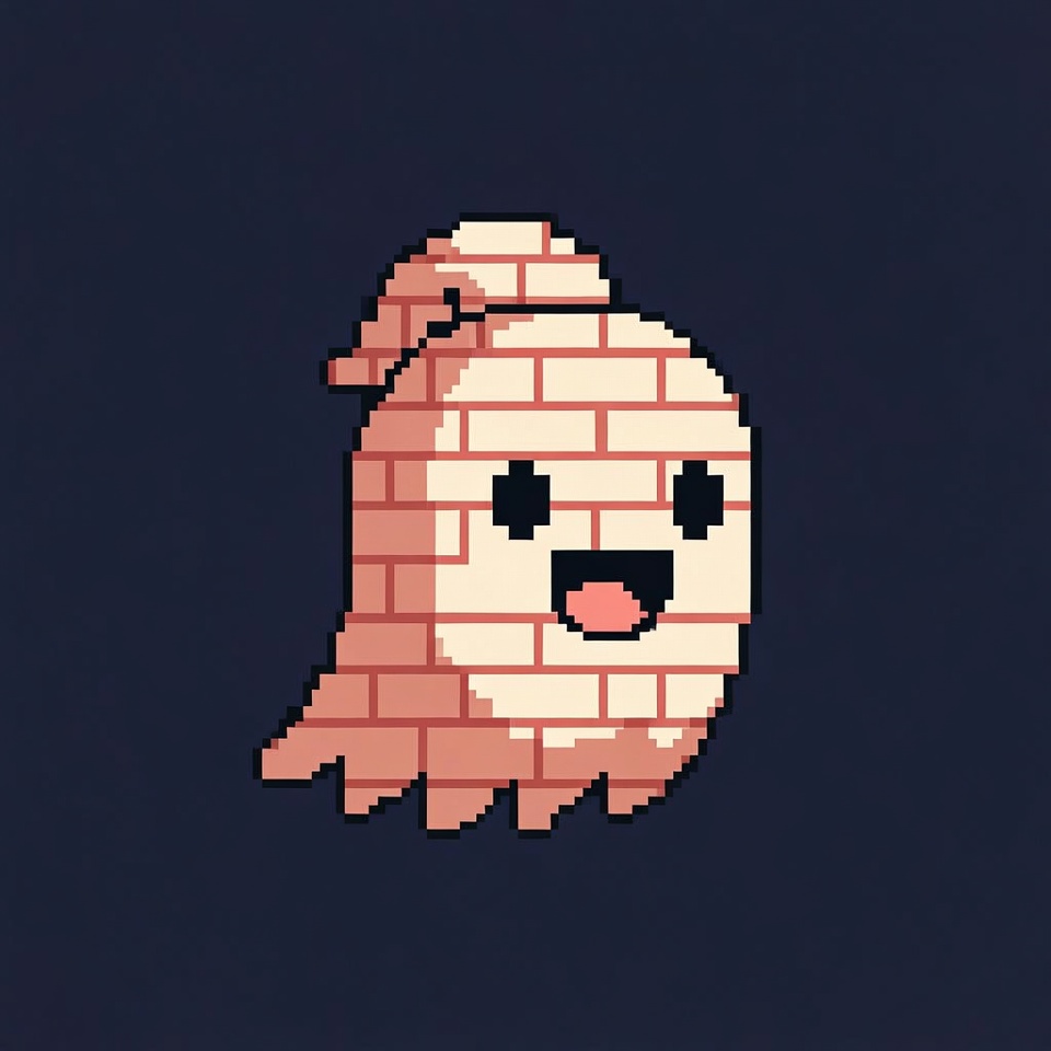 A cute pixel art ghost made of bricks floats against a dark background. It has a white brick face with black eyes and a wide pink smile. A small brick hat sits on top of its pinkish brick-like body.