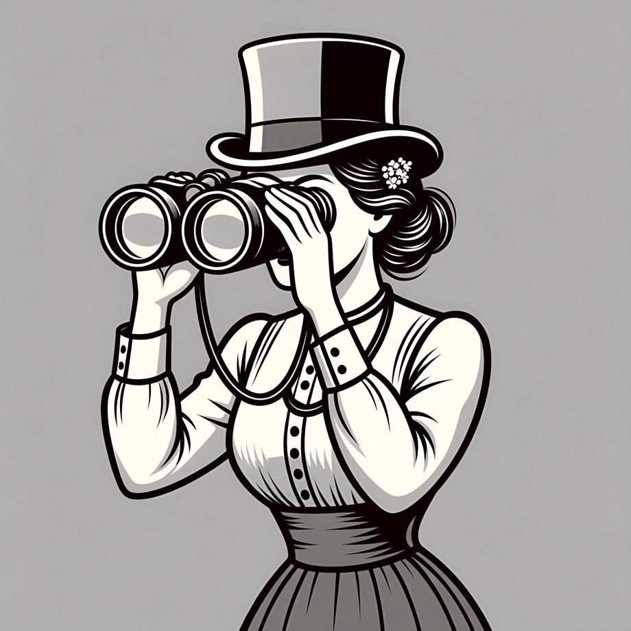 A black and white line art illustration depicts a woman in Victorian attire peering through binoculars. She wears a top hat, a high-collared blouse with buttons, a corset, and a skirt, with her hair styled in an updo adorned with a flower. The figure is centered on a gray isolated background.