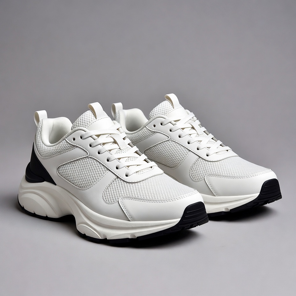 black accents, casual shoes, chunky sneakers, footwear, isolated background, lace-up shoes, mesh panels, platform shoes, running shoes, shoes, sneakers, sneakers pair, sporty footwear, thick soles, white shoes, white sneakers