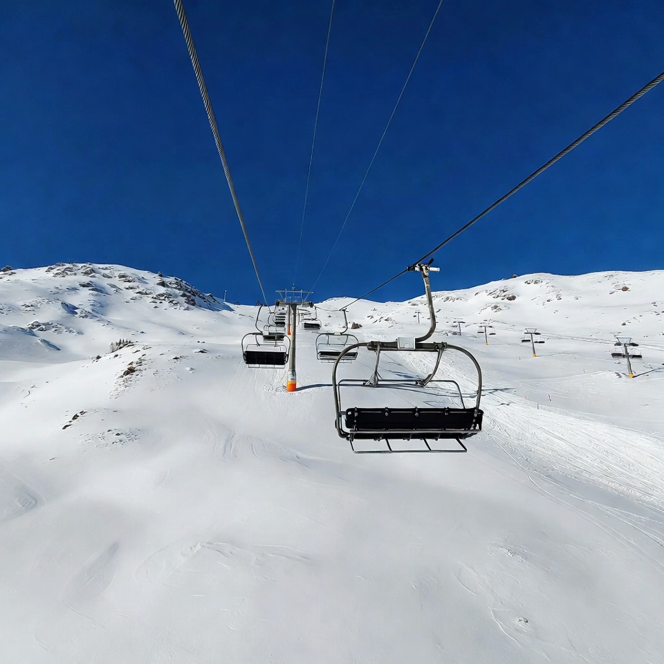 alpine scenery, blue sky, cables, chairlift, empty chairs, lift towers, mountains, powder snow, ski area, ski resort, snow slope, snowy mountain, white snow, winter sports, ski lift